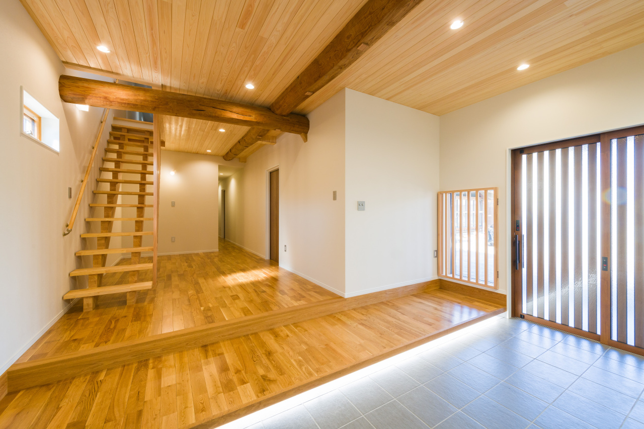 先代が残した納屋を、リノベーションによって、耐震性・快適性を向上させた【耐震改修の家】です。大きな丸太の一部を室内空間に残したほか、2階に約30帖のLDKを配置するなど、全面的な改修を行っています。どうぞご覧ください。
